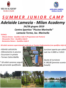 Anche quest’anno l’Adelaide Lamezia – Milan Academy svolgerà il summer junior camp per tutti i giovani atleti che intendono continuare a divertirsi giocando a calcio, e non solo, durante la stagione estiva.