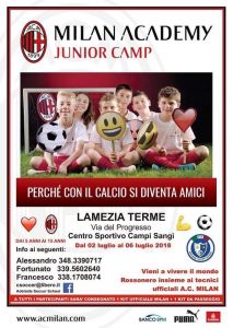 Inizierà domani, lunedì 2 luglio e durerà fino a venerdì 6, il Milan Junior Camp organizzato dalla Adelaide soccer school di Lamezia Terme. Il campus estivo del Milan, che fa tappa nella nostra città per la seconda volta consecutiva, quest’anno si svolgerà presso il Centro sportivo “Sangì” di Via del Progresso. Le adesioni, aperte non solo per i ragazzi ma anche per le ragazze, riguardano atleti e atlete dai 5 ai 15 anni e sarà possibile iscriversi anche lunedì mattina presso la struttura sportiva che ospita il camp. I ragazzi e le ragazze che parteciperanno vivranno cinque giornate all’insegna dello sport e del divertimento. A supervisionare il camp sarà mister Danilo Tedoldi, figura di spicco della Milan Academy, che svolgerà il ruolo di direttore tecnico. La grande esperienza e la riconosciuta professionalità di mister Tedoldi garantirà qualità sia sotto l’aspetto tecnico che umano. Il tutto in sinergia con lo staff tecnico della Adelaide che, insieme al Presidente Alessandro Vinci e al Vice Francesco Fruci, è composto dai tecnici Giuseppe Saladino (direttore tecnico Adelaide con qualifica Uefa B, in questi giorni impegnato a Corveciano per il conseguimento della qualifica Uefa A), Beniamino Notaro, Antonio Chirumbolo e Gianluca Fiorino (anch’essi tutti con qualifica Uefa B). Lo scopo del Milan Junior camp è quello di rendere protagonisti i ragazzi che, rigorosamente con kit ufficiali Milan, saranno al centro del progetto e delle attenzioni dei tecnici per favorirne la crescita umana oltre che sportiva.