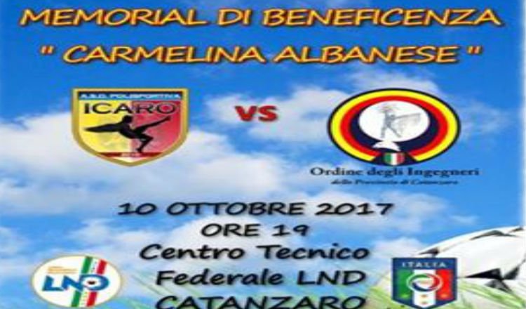 Martedì 10 alle ore 19.00 presso il Centro Tecnico Federale di Catanzaro Sala si terrà un incontro di calcio tra le squadre ICARO 2010 ed INGEGNERI CATANZARO, dedicato alla memoria della professoressa Carmela Albanese, scomparsa di recente, madre dell’ing. Salvatore Tucci, consigliere dell’Ordine di Catanzaro e presidente della ASD Pol. Icaro 2010. Il ricavato sarà devoluto in beneficenza per la ricerca scientifica contro il cancro del Policlinico di Germaneto ed all’Istituto Palazzolo di Santa Maria. I familiari ringraziano per la fattiva collaborazione e sensibilità atteso lo scopo benefico dell’iniziativa. Si ringraziano la FIGC-LND ed il servizio ambulanza F.lli Ranieri per la collaborazione.