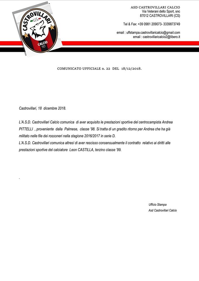 Calcio Serie D Castrovillari, torna Pittelli dalla Palmese Scritto da Massimo Scerbo Postato 19 Dicembre 2018 48 second read 0 0 Condividi su Facebook Condividi su Twitter Condividi su Google+ Condividi su Reddit Condividi su Pinterest Condividi su Linkedin Condividi su Tumblr