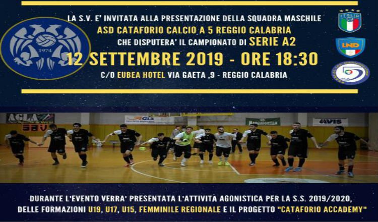 PRESENTAZIONE – Il Cataforio apre ufficialmente i battenti per la stagione 2019-2020 e lo fa presso la splendida location dell’Hotel Eubea dove avverrà la presentazione della squadra e di tutti i programmi stagionali che spazieranno dal campionato di Serie A2, ai campionati giovanili e femminili, oltre la scuola calcio. Un appuntamento da non perder dopo del quale è previsto anche un aperitivo.