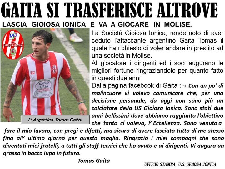 La società Vallata del Torbido rende noto di aver provveduto alla rescissione consensuale del contratto con il Calciatore Giuseppe Denaro. Il club augura le migliori fortune per il prosieguo dell’attività calcistica. Il calciatore, dunque, è da ora svincolato. Con l’occasione si comunica, inoltre, che la società è attiva sul mercato di riparazione per chiudere gli innesti richiesti da mister Cosimo Silvano.