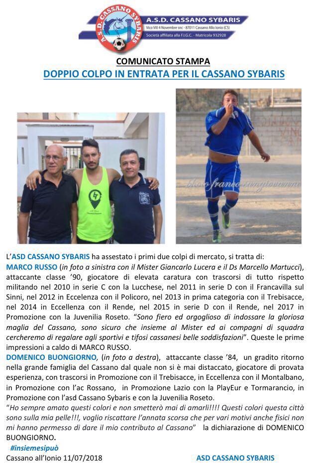 Calcio Promozione Doppio innesto di valore per il Cassano Sybaris Scritto da Massimo Scerbo Postato 12 Luglio 2018 48 second read 0 0 Condividi su Facebook Condividi su Twitter Condividi su Google+ Condividi su Reddit Condividi su Pinterest Condividi su Linkedin Condividi su Tumblr