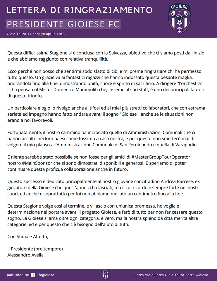 Calcio Promozione Gioiese FC, la lettera di ringraziamento del Presidente Avella Scritto da Massimo Scerbo Postato 4 Maggio 2018 45 second read 0 0 Condividi su Facebook Condividi su Twitter Condividi su Google+ Condividi su Reddit Condividi su Pinterest Condividi su Linkedin Condividi su Tumblr