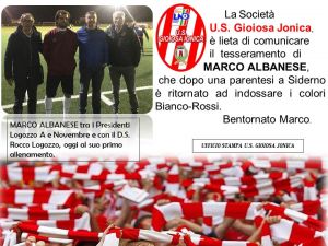 La società U.S. Gioiosa Jonica è lieta di comunicare il tesseramento di Marco Albanese che, dopo una parentesi a Siderno, è ritornato ad indossare i colori biancorossi. Bentornato Marco.