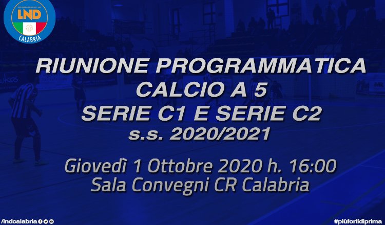 Giovedì 01 Ottobre 2020 alle ore 16:00 presso la sala convegni del Comitato Regionale Calabria si terrà un incontro formativo con le società di Calcio a 5 Serie C1 e Serie C2.
