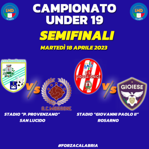 Campionato Under 19 regionale che arriva alle battute conclusive: martedì tornano in campo le quattro società qualificate per la semifinale in gara unica su campo neutro. I campioni in carica della Morrone unica conferma rispetto a dodici mesi fa. Fischio d’inizio previsto per entrambe alle ore 15: allo stadio “Provenzano” di San Lucido si sfidano Digiesse PraiaTortora e Morrone, mentre al “Giovanni Paolo II” di Rosarno saranno Gioiosa Jonica e Gioiese a contendersi il pass per l’ultimo e decisivo atto. La finale che assegnerà il titolo di campione regionale Under 19 verrà disputata martedì 2 maggio, alle ore 15.30, presso il “Centro Tecnico Federale” di Catanzaro.