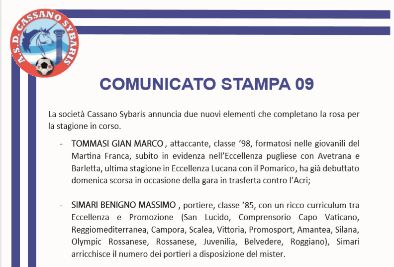 Calcio Promozione Il Cassano Sybaris pesca due volte dalla lista degli svincolati Scritto da Massimo Scerbo Postato 9 Ottobre 2019 42 second read 0 0 Condividi su Facebook Condividi su Twitter Condividi su Google+ Condividi su Reddit Condividi su Pinterest Condividi su Linkedin Condividi su Tumblr
