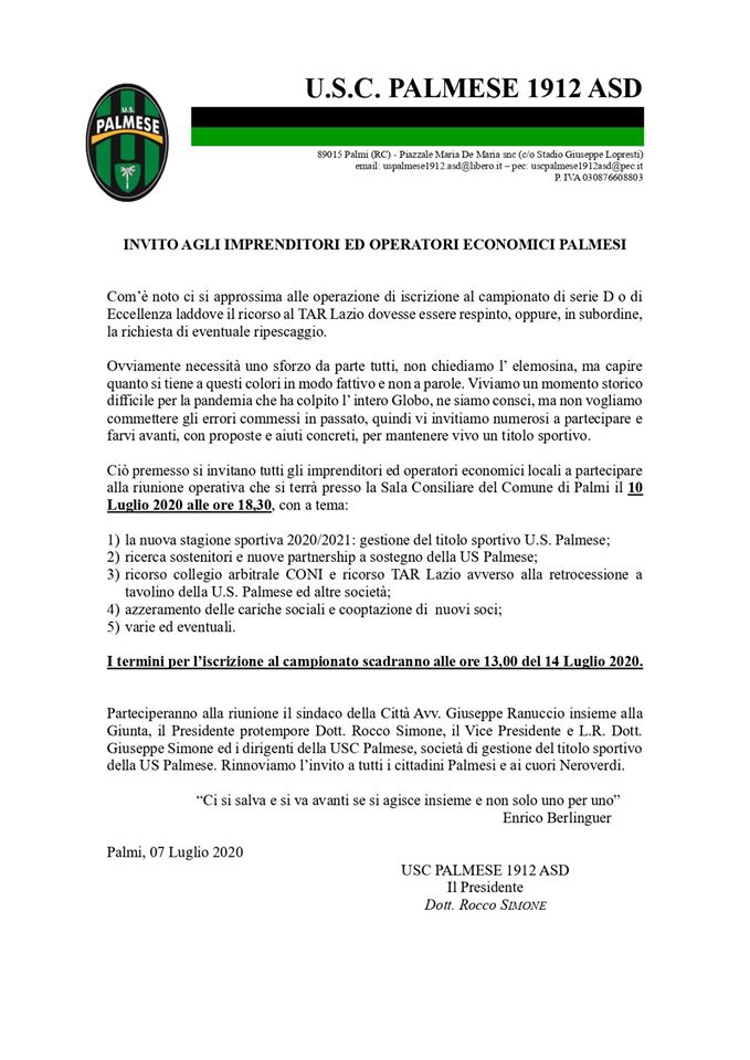 Calcio Eccellenza La Palmese chiede aiuto: venerdì riunione presso la sala consiliare del comune Scritto da Redazione Calabriadilettanti.it Postato 8 Luglio 2020 45 second read 0 0 Condividi su Facebook Condividi su Twitter Condividi su Google+ Condividi su Reddit Condividi su Pinterest Condividi su Linkedin Condividi su Tumblr