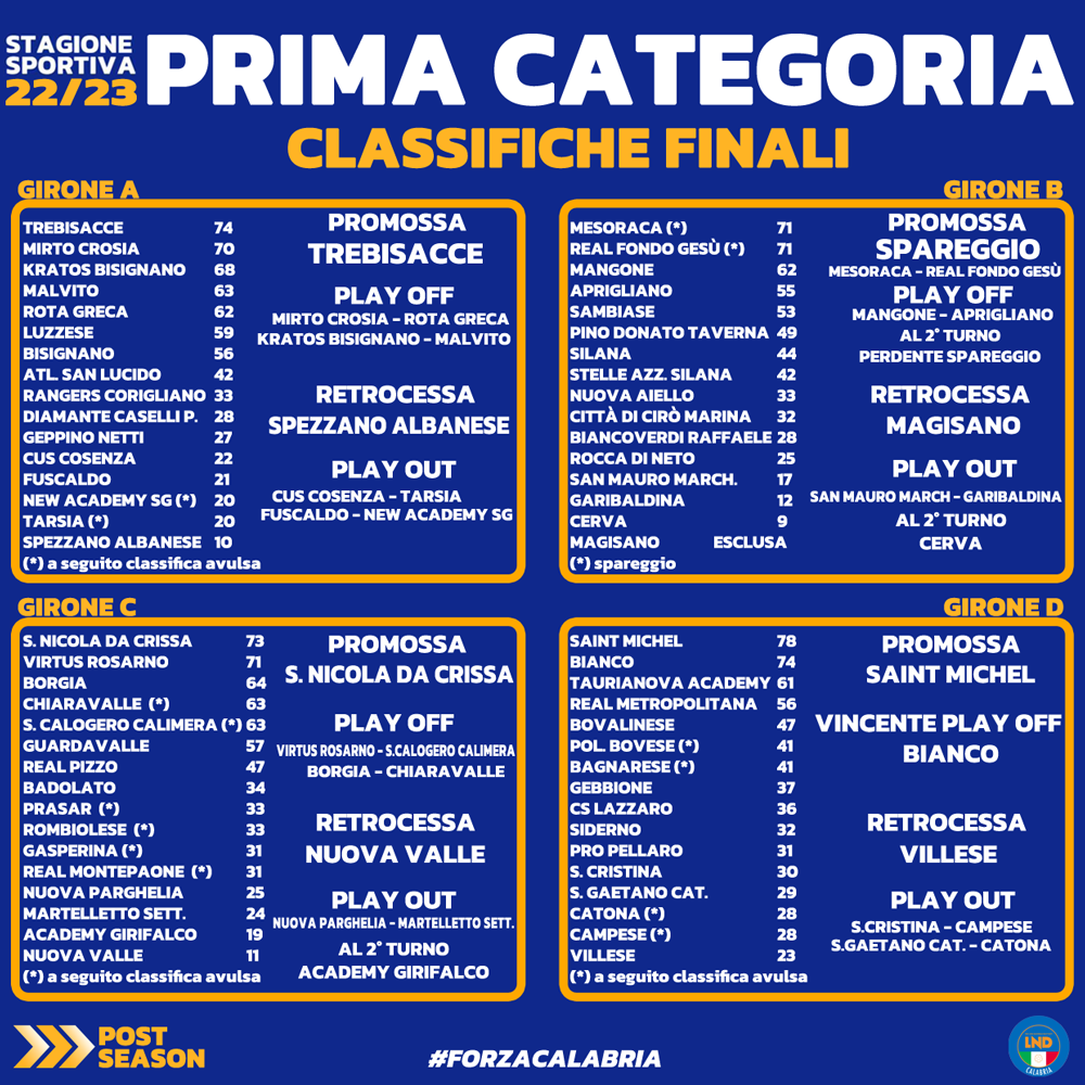 Nel weekend al via anche la post season con le gare delle semifinali play off e play out nei quattro gironi. Preliminarmente, come da regolamento, va ricordato che le due vincenti play off si incontreranno successivamente nella finale del girone per determinare la squadra che poi andrà a contendersi un posto in Promozione tramite lo spareggio (vincente girone A contro vincente girone B; vincente girone C contro vincente girone D). Per i play out, invece, le due squadre che risulteranno perdenti si sfideranno in una gara ulteriore, quella che determinerà la seconda retrocessione per girone. Nel girone A le due semifinali play off saranno Mirto Crosia-Rota Greca e Kratos Bisignano-Malvito, mentre le due sfide salvezza vedranno impegnate CUS Cosenza-Tarsia e Fuscaldo-New Academy SG. Nel girone B, la perdente dello spareggio per il primo posto sarà già qualificata per la finale play off in cui affronterà la vincente della gara tra Mangone ed Aprigliano. Semifinale play out in cui si scontreranno San Mauro Marchesato e Garibaldina. La perdente, poi, affronterà il Cerva. Nel girone C, Virtus Rosarno-San Calogero Calimera e Borgia-Chiaravalle si contendono il pass per la finale play off, mentre in chiave salvezza scontro tra Real Mileto e MartellettoSettingiano, con la perdente che affronterà successivamente l’Academy Girifalco. Nel girone D, infine, il Bianco ha già acquisito il diritto di disputare lo spareggio intergirone per la promozione grazie alla regola dei dieci punti sulla terza in classifica. Play out che vedranno di fronte S. Cristina-Campese e S.G. Catanoso-Catona.