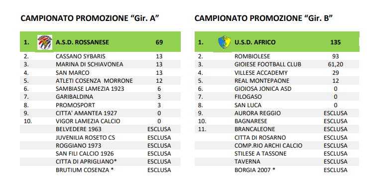 Con riferimento ai Comunicati Ufficiali L.N.D. n. 200 del 28 Dicembre 2018 e n. 209 del 31 Gennaio 2019 relativi al progetto di valorizzazione dei giovani calciatori nei Campionati Regionali di Eccellenza e di Promozione della Stagione Sportiva 2018/2019, il Consiglio Direttivo del Comitato Regionale Calabria – Lega Nazionale Dilettanti ha deliberato che saranno riconosciuti i sotto indicati importi alle Società prime classificate nelle graduatorie dei rispettivi gironi dei Campionati di Eccellenza e di Promozione s.s.2018/2019: