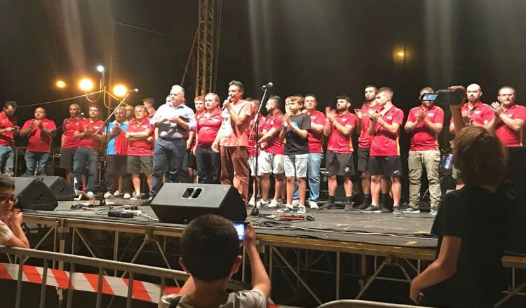 Sul palco in ordine sparso erano presenti dirigenti e calciatori, man mano che venivano nominati da Aronne, questi salutavano la piazza gremita da rocchesi e turisti.