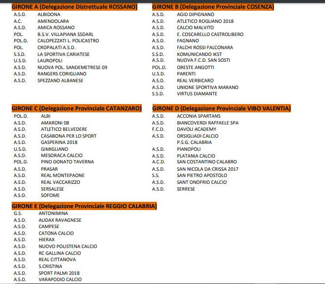 RIPESCATE: Agid Dipignano, Audax Ravagnese, Campese, Falchi Rossi Falconara, Lauripoli, Mesoraca, San Sosti, Pino Donato Taverna, S. Costantino Calabro, Sersalese, Spezzano Albanese.