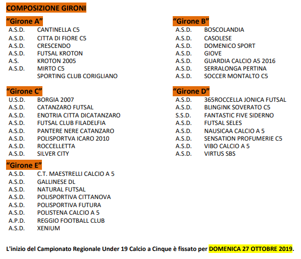 Il Comitato Regionale Calabria della L.N.D. organizza il Campionato Regionale Under 19 C5 riservato alle società partecipanti ai Campionati di Serie C1 e C2, nonché a quelle che ne hanno fatto esplicita richiesta. Oltre alla Nuova Fabrizio, hanno rinunciato anche F.C. Paola e Rossano C.S., ammesse le non aventi diritto Borgia, Pantere Nere e Pol. Futura. L’inizio del Campionato Regionale Under 19 C5 è fissato per DOMENICA 27 OTTOBRE 2019. Tutti a caccia dell’Enotria Città di Catanzaro, campione uscente e arrivata fino alla final four scudetto.